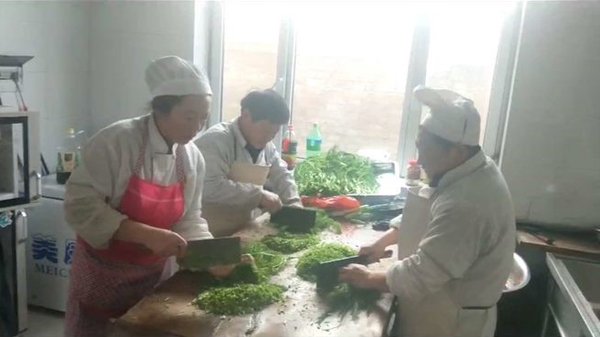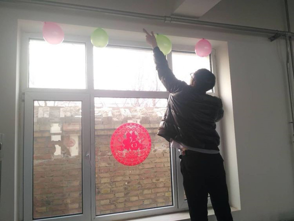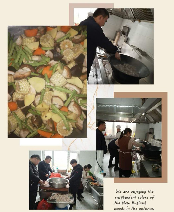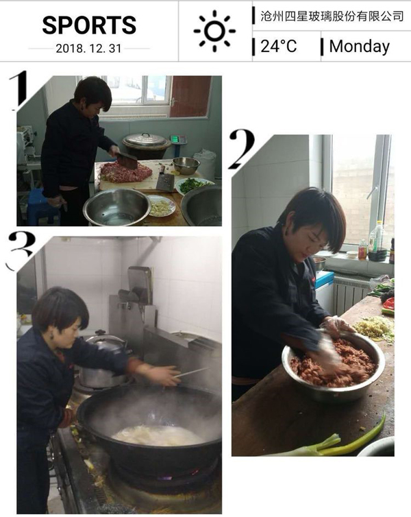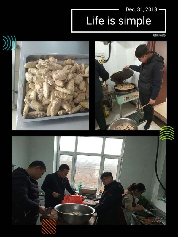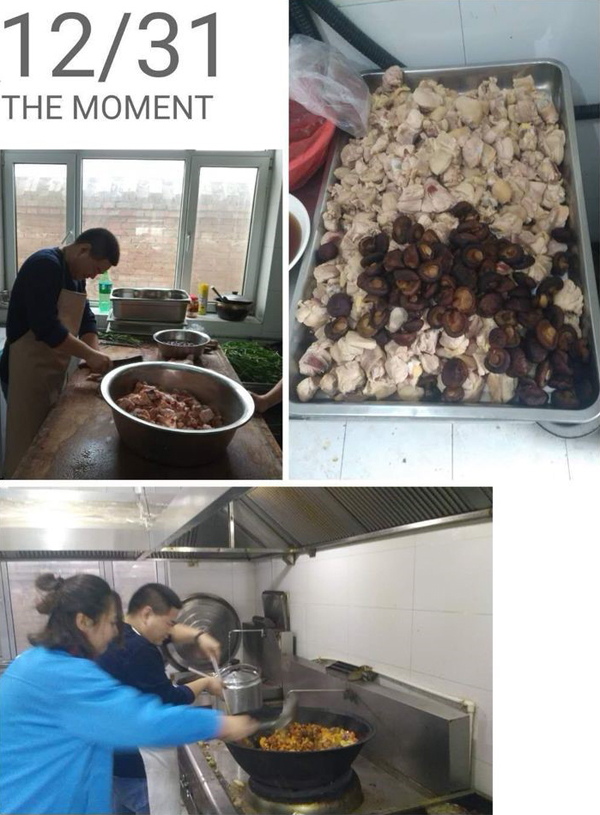 大家伙共同布置我們的會(huì)場(chǎng),貼福字,掛條幅,換桌布,有些同事自己從家里拿案板與廚具。四星也是我們的家。