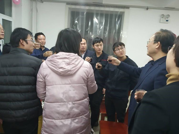 銷售部王云濤總,傾情提了四杯酒,敬董事長(zhǎng),敬自己,敬幕后人員。郝總代表大家為王總斟了一杯大酒,希望他2019年業(yè)績(jī)所向披靡,拿下5000萬(wàn)目標(biāo)。他中招干了半杯,銷售酒量一般都是兩斤啊,神勇。后勤部王震山總勇猛做陪,一起炸了半杯。